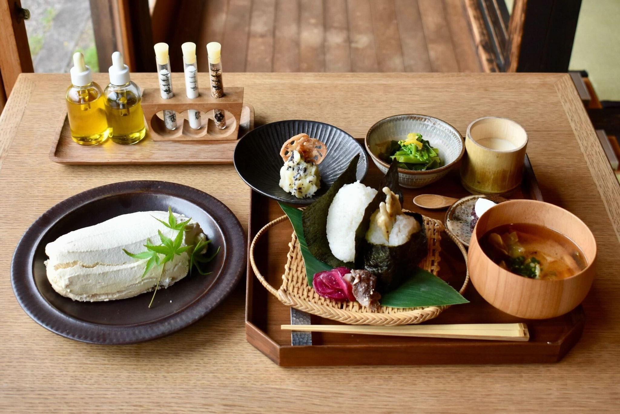 “かまどで薪を使い羽釜で炊いたお米”と塩屋ならではのおむすびの具材、お味噌汁、一品をご堪能いただけます。