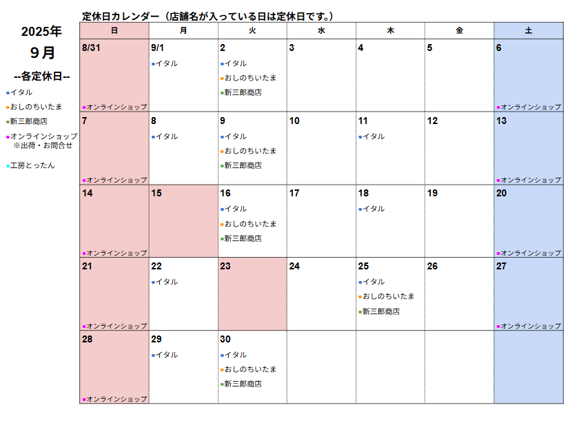 工房とったん 新三郎商店 ゴハンヤイタル おしのちいたま 2025年8月25日いつも、工房とったん、新三郎商店、ゴハンヤ イタル、おしのちいたまをご利用いただき誠にありがとうございます。9月の営業を下記のとおりお知らせいたします。